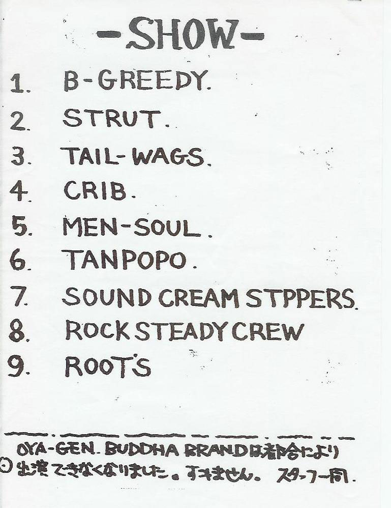 この回は『OYA-GEN』と『BUDDAH BRAND』が当日欠場した。